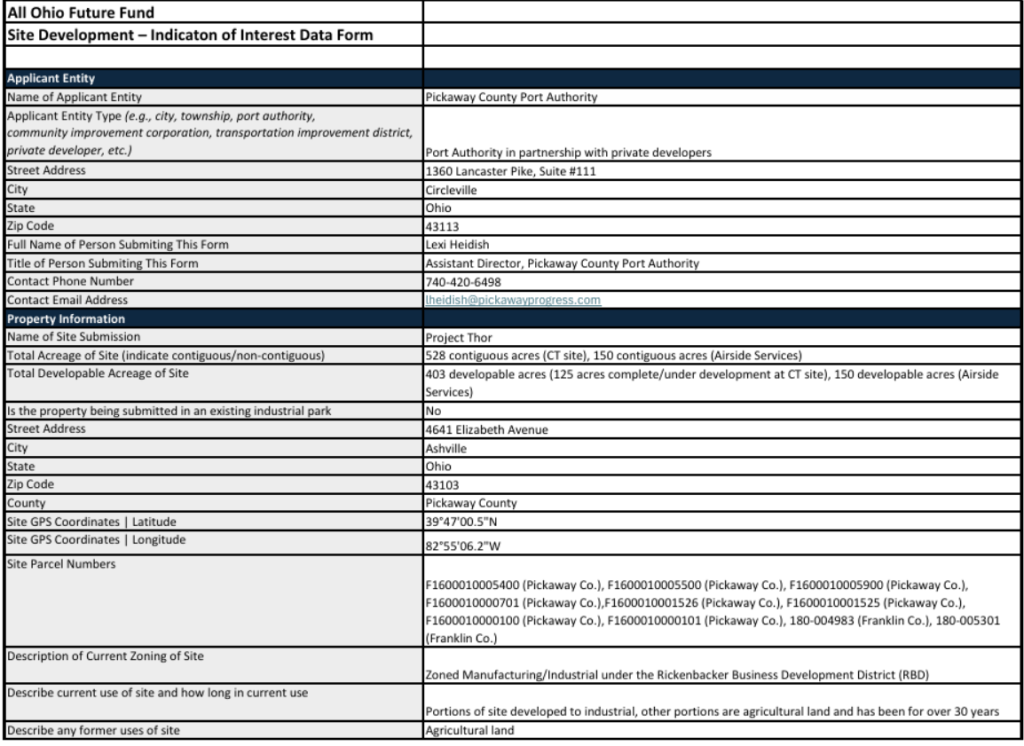Despite the project’s fanfare, inconsistencies in zoning and land ownership have raised concerns about the site’s readiness for immediate development. Documents from the Pickaway County Port Authority’s application to the All Ohio Future Fund indicate that the site spans 528 acres, with 403 acres designated as “developable” under the Rickenbacker Business Development District (RBD). However, 120 acres of this land are not zoned for industrial use, contradicting claims made in official filings.